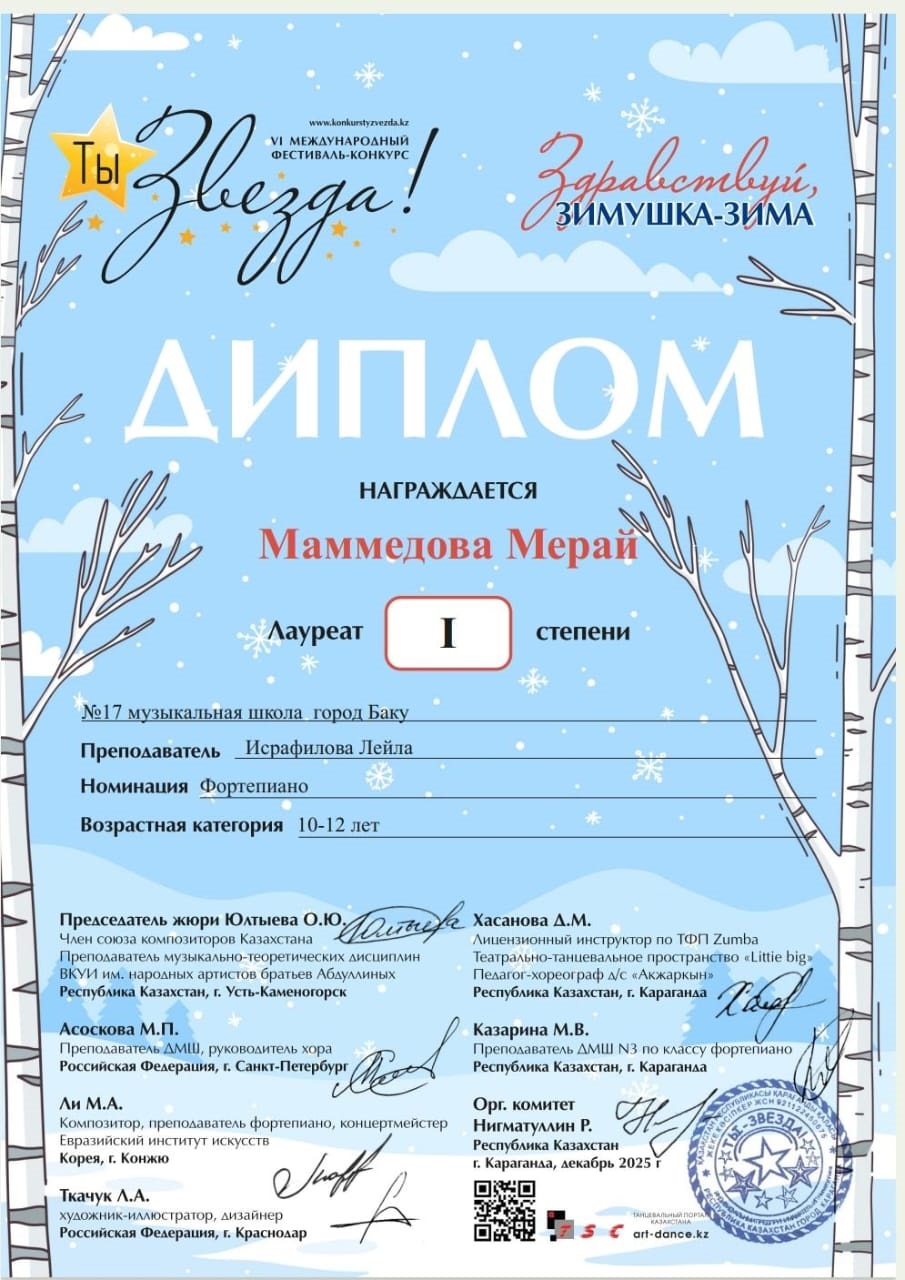Həmçinin Meray Məmmədova Qazaxstan Respublikasında onlayn keçirilən “Ты Звезда” adlı VI Beynəlxalq Festival Müsabiqədə iştirak edib. O, fortepiano nominasiyasında 10-12 yaş kateqoriyası üzrə çıxış edərək I dərəcəli laureat adına layiq görülüb.