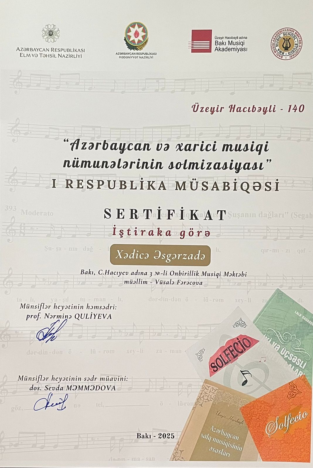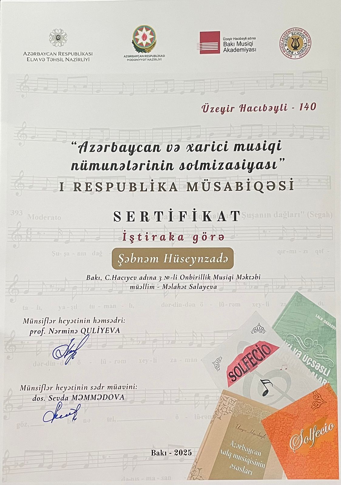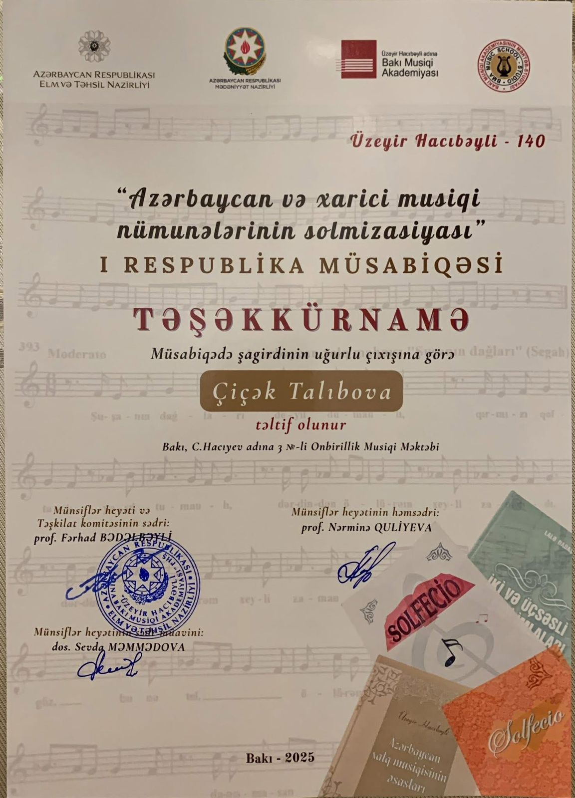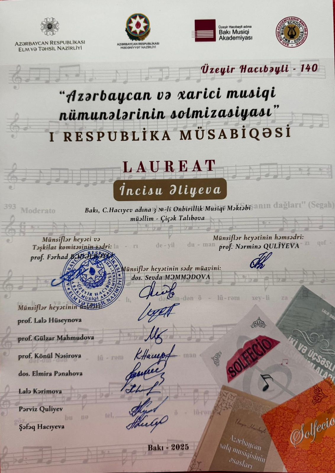 Bakı Şəhər Mədəniyyət Baş İdarəsinin tabeliyində olan C.Hacıyev adına 3 nömrəli Onbirillik Musiqi Məktəbinin Violin ixtisası üzrə təhsil alan IV sinif şagirdi İncisu Əliyeva "Azərbaycan və xarici musiqi nümunələrinin solmizasiyası" adlı I Respublika müsabiqəsində iştirak edib.