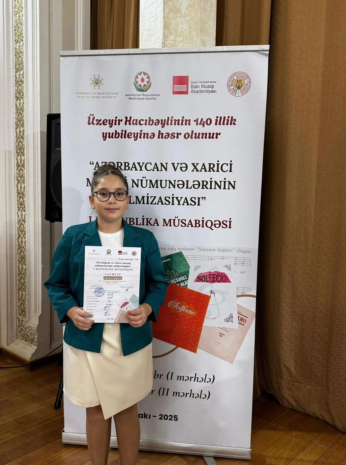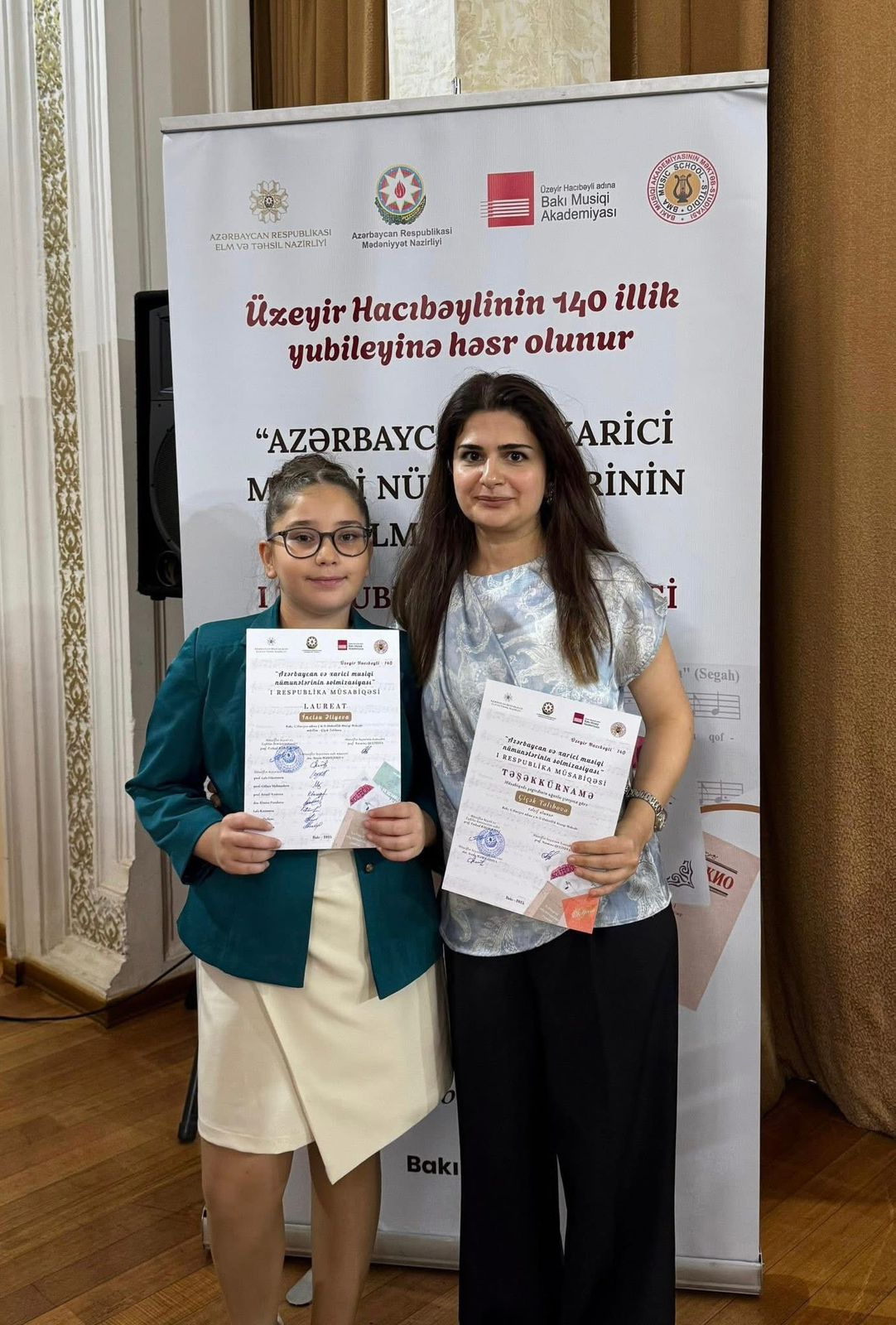 Üzeyir Hacıbəylinin 140 illik yubileyinə həsr edilmiş festival proqramı çərçivəsində keçirilən müsabiqədə İncisu Əliyeva yüksək hazırlıq səviyyəsi nümayiş etdirərək Laureat adına layiq görülüb. Şagirdin nəzəriyyə müəllimi Çiçək Talıbova isə Təşəkkürnamə ilə təltif olunub. Şagirdlər Əsgərzadə Xədicə (müəllim Vüsalə Fərəcova) və Hüseynzadə Şəbnəm (müəllim Məlahət Salayeva) isə Sertifikatla təltif olunublar.