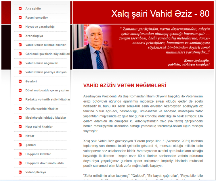 Vahid Əzizin 80 illik yubileyi ilə əlaqədar hazırlanan videomaterial kitabxananın rəsmi saytında yerləşdirilib.