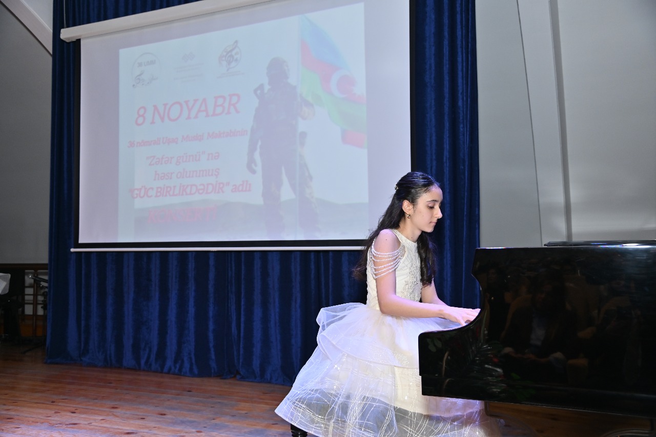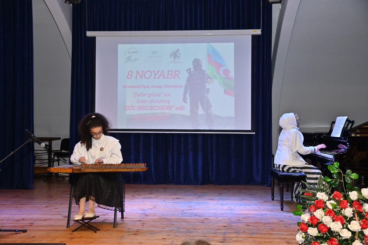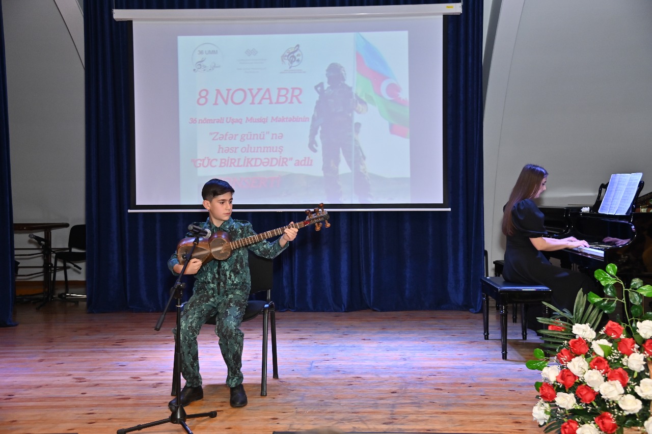 Bakı Şəhər Mədəniyyət Baş İdarəsinin tabeliyində olan 36 nömrəli Uşaq Musiqi Məktəbinin 8 Noyabr - Zəfər Gününə həsr olunmuş "Güc birlikdədir" adlı konserti keçirilib.