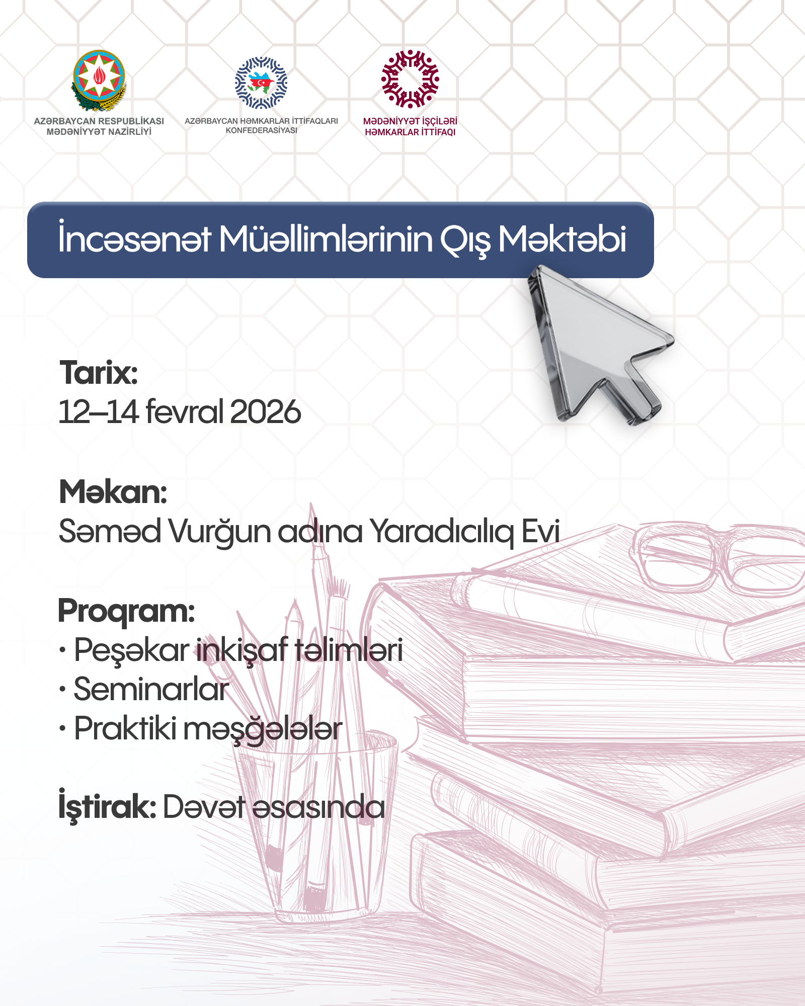 Azərbaycan Respublikası Mədəniyyət Nazirliyi və Azərbaycan Həmkarlar İttifaqları Konfederasiyasının üzv təşkilatı olan Mədəniyyət İşçiləri Həmkarlar İttifaqının birgə təşkilatçılığı ilə “İncəsənət müəllimlərinin qış məktəbi” adlı layihə həyata keçiriləcək.