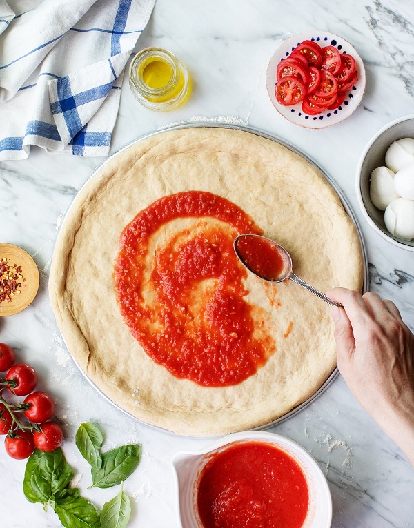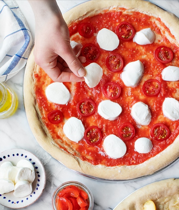 İlk öncə pizzanın xəmirini yoğurun və ən azı 30 dəqiqə isti yerdə dincə qoyun. Daha sonra pomidorları sürtgəcdən keçirib, bir qaşıq zeytun yağı töküb, ocağa qoyun. Pizza xəmirini yaymazdan öncə zeytun yağı ilə yağlayıb, sonra xəmiri açın. Üzərinə pomidor sousunu və xırda-xırda doğranmış mozarella pendirini də əlavə edin. Sonra 2 xörək qaşığı zeytun yağını üzərində əlavə edin. Kəklikotu səpin. Əvvəlcədən qızdırılmış sobada 250 dərəcə temperaturda 20 dəqiqəyə bişirin. Pizza hazırdır.