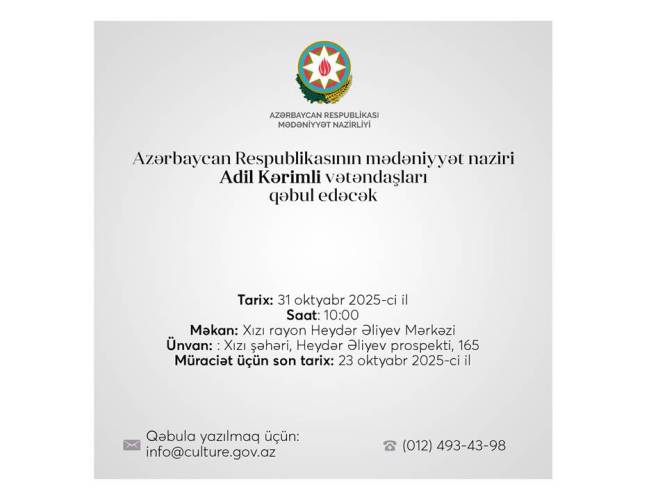 Mərkəzi icra hakimiyyəti orqanları və digər idarəetmə qurumlarının rəhbərlərinin şəhər və rayonlarda vətəndaşların qəbulu cədvəlinə əsasən Azərbaycan Respublikasının mədəniyyət naziri Adil Kərimli tərəfindən 2025-ci il oktyabrın 31-də, saat 10:00-da Xızı rayon Heydər Əliyev Mərkəzində (ünvan: Xızı şəhəri, Heydər Əliyev prospekti, 165) Sumqayıt şəhəri, Xızı, Abşeron, Qubadlı, Zəngilan rayonlarından olan vətəndaşların qəbulu keçiriləcəkdir.