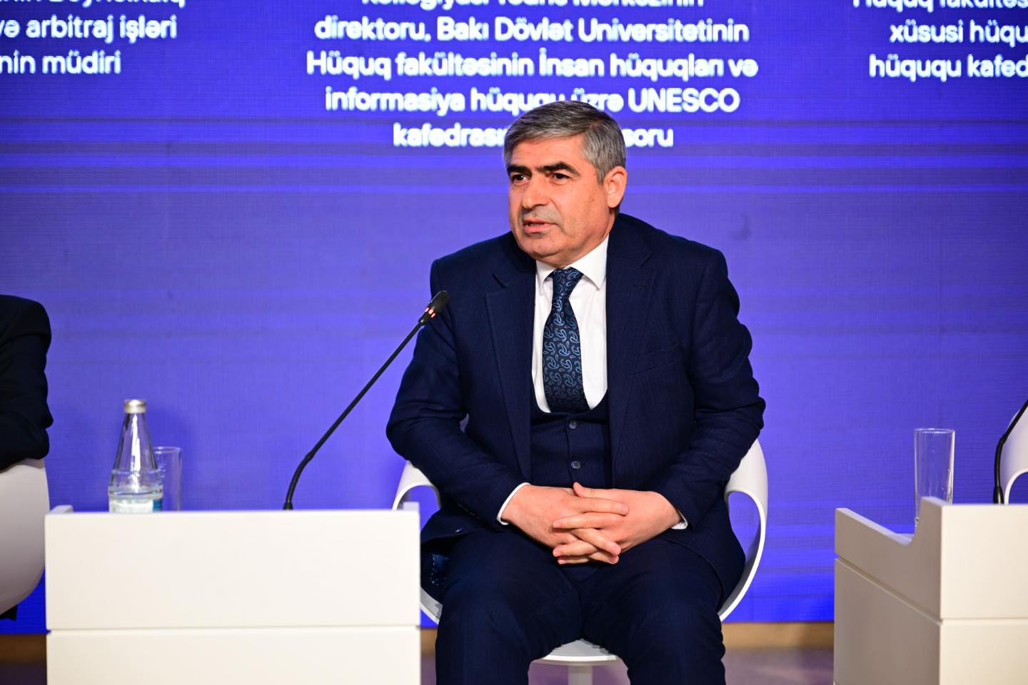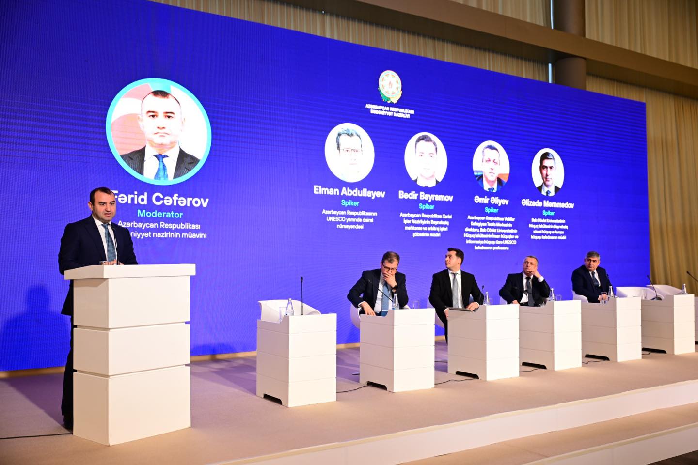 Azərbaycan Respublikasının UNESCO yanında daimi nümayəndəsi Elman Abdullayev, Xarici İşlər Nazirliyi Beynəlxalq məhkəmə və arbitraj işləri şöbəsinin müdiri Bədir Bayramov, Bakı Dövlət Universitetinin (BDU) Hüquq fakültəsi Beynəlxalq xüsusi hüquq və Avropa hüququ kafedrasının müdiri Əlizadə Məmmədov və Azərbaycan Respublikası Vəkillər Kollegiyası Tədris Mərkəzinin direktoru, BDU Hüquq fakültəsinin İnsan hüquqları və informasiya hüququ üzrə UNESCO kafedrasının professoru Əmir Əliyev qeyd olunan mövzular üzrə çıxış ediblər.