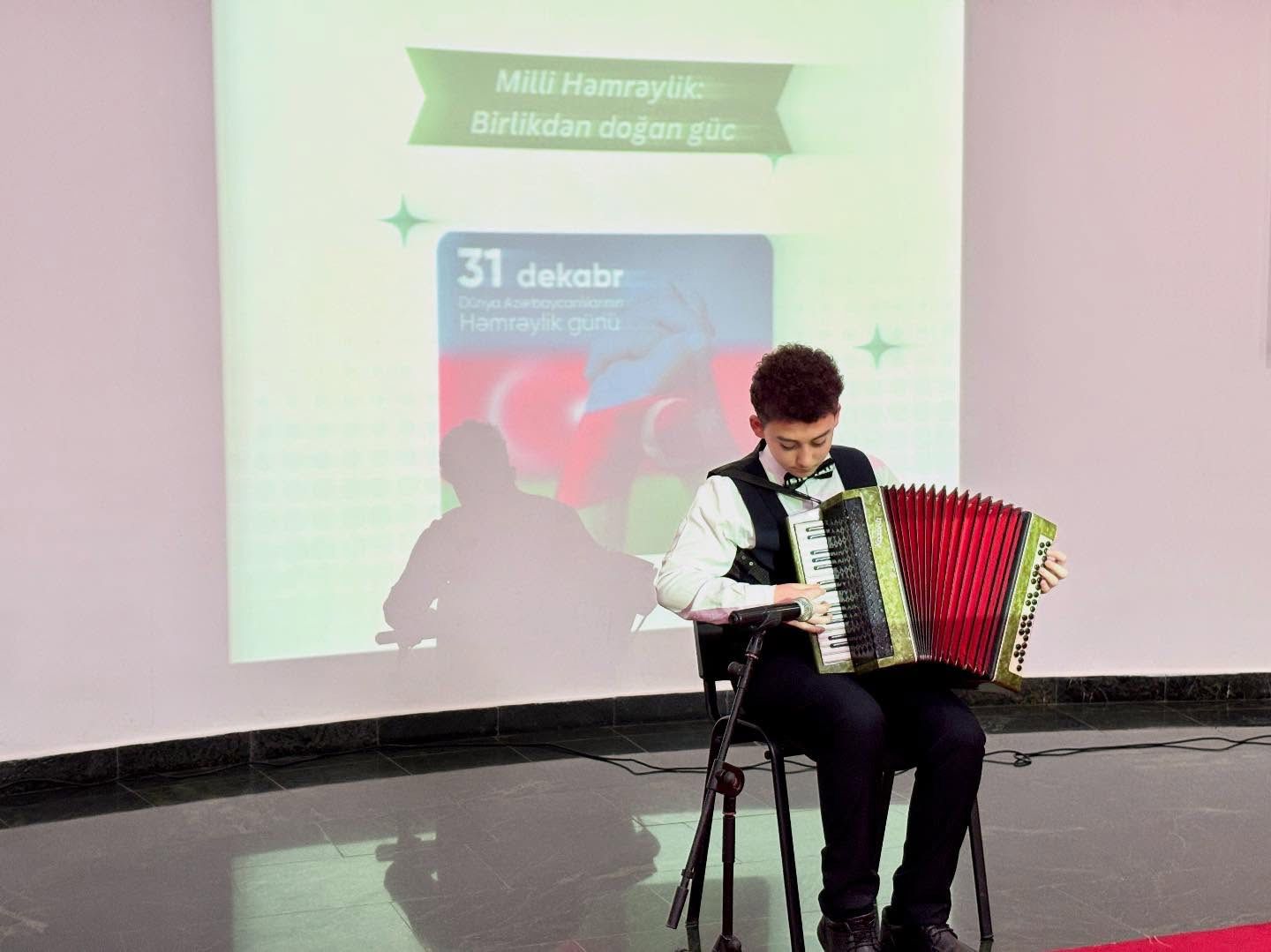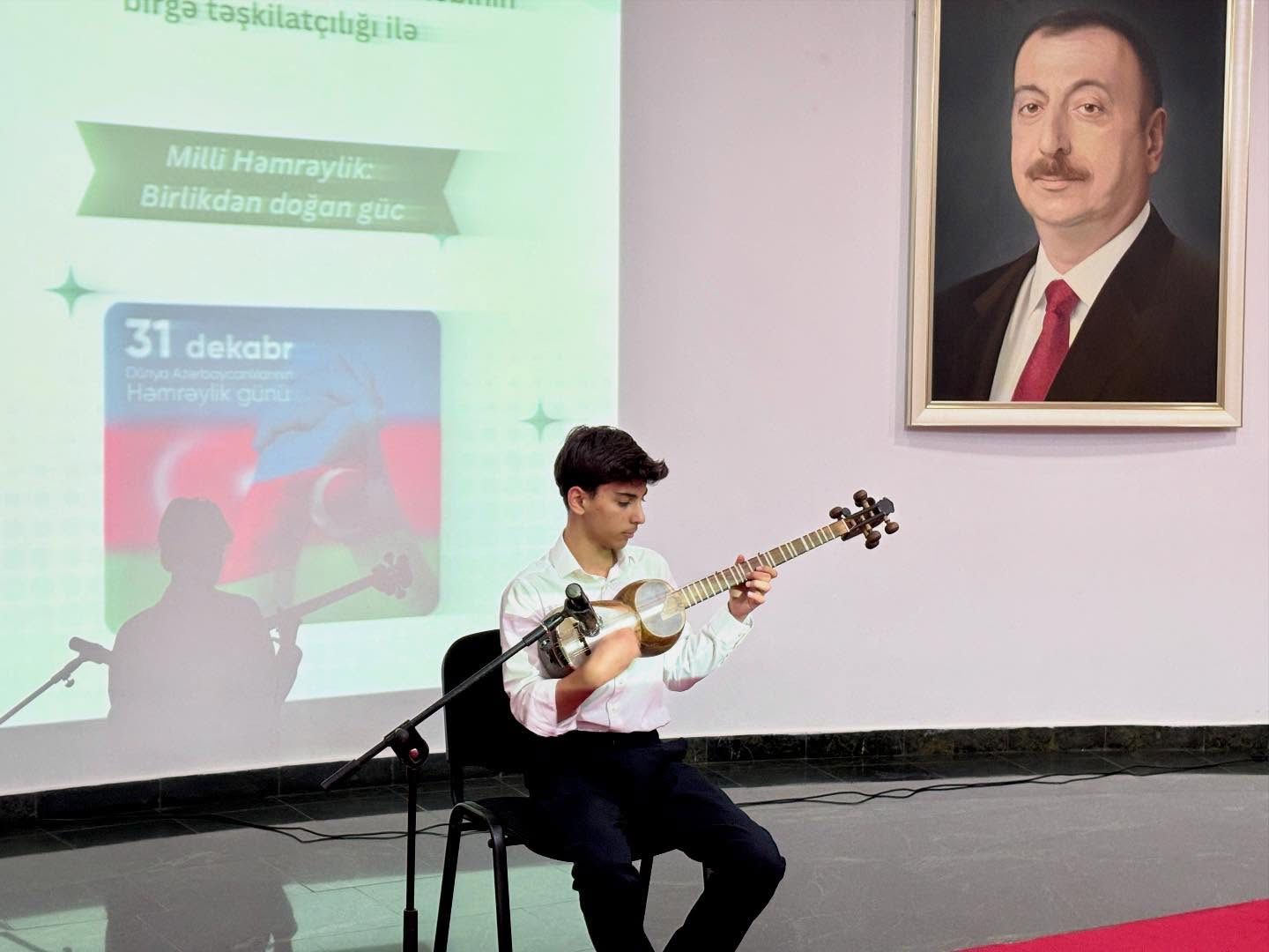 31 dekabr-Dünya Azərbaycanlılarının Həmrəyliyi Gününə həsr olunmuş tədbirdə rəsmilər, mədəniyyət işçiləri, idarə və müəssisələrin əməkdaşları və digər qonaqlar iştirak ediblər.