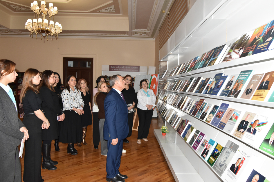 Daha sonra tədbir iştirakçıları “Azərbaycanın özü qədər əbədi olan şəxsiyyəti Heydər Əliyev” mövzusunda ənənəvi sərgiyə baxış keçiriblər. Sərgidə kitabxananın fondlarında qorunan dahi şəxsiyyətin həyatının müxtəlif dövrlərini əks etdirən kitablar, sənədlər, fotolar nümayiş olunur.