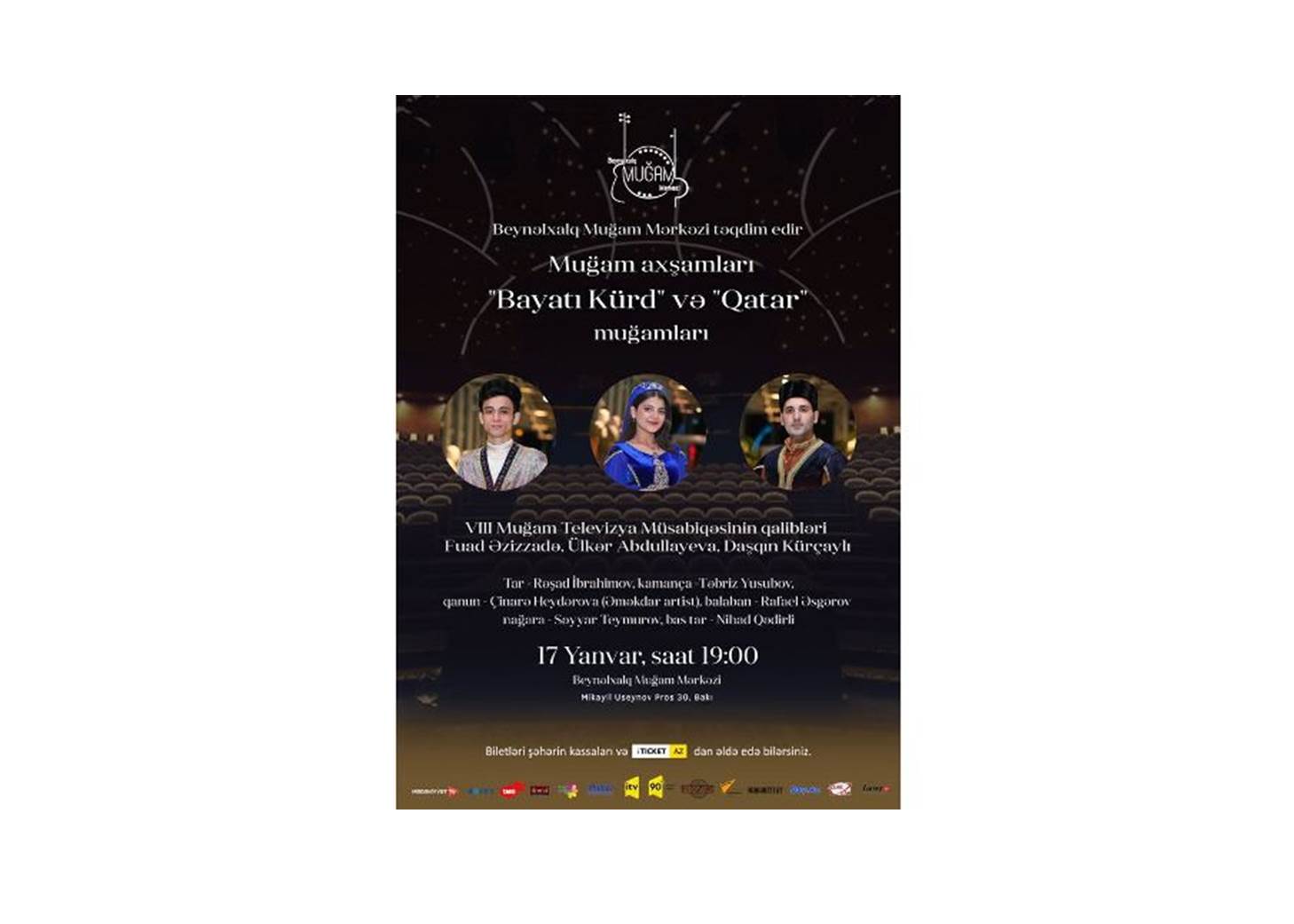 Yanvarın 17-də Beynəlxalq Muğam Mərkəzində “Muğam axşamları” layihəsinin növbəti konserti keçiriləcək. Musiqi gecəsində “Bayatı Kürd” və “Qatar” muğamlarını VIII Muğam Televiziya Müsabiqəsinin qalibləri Fuad Əzizzadə, Ülkər Abdullayeva və Daşqın Kürçaylı təqdim edəcəklər.