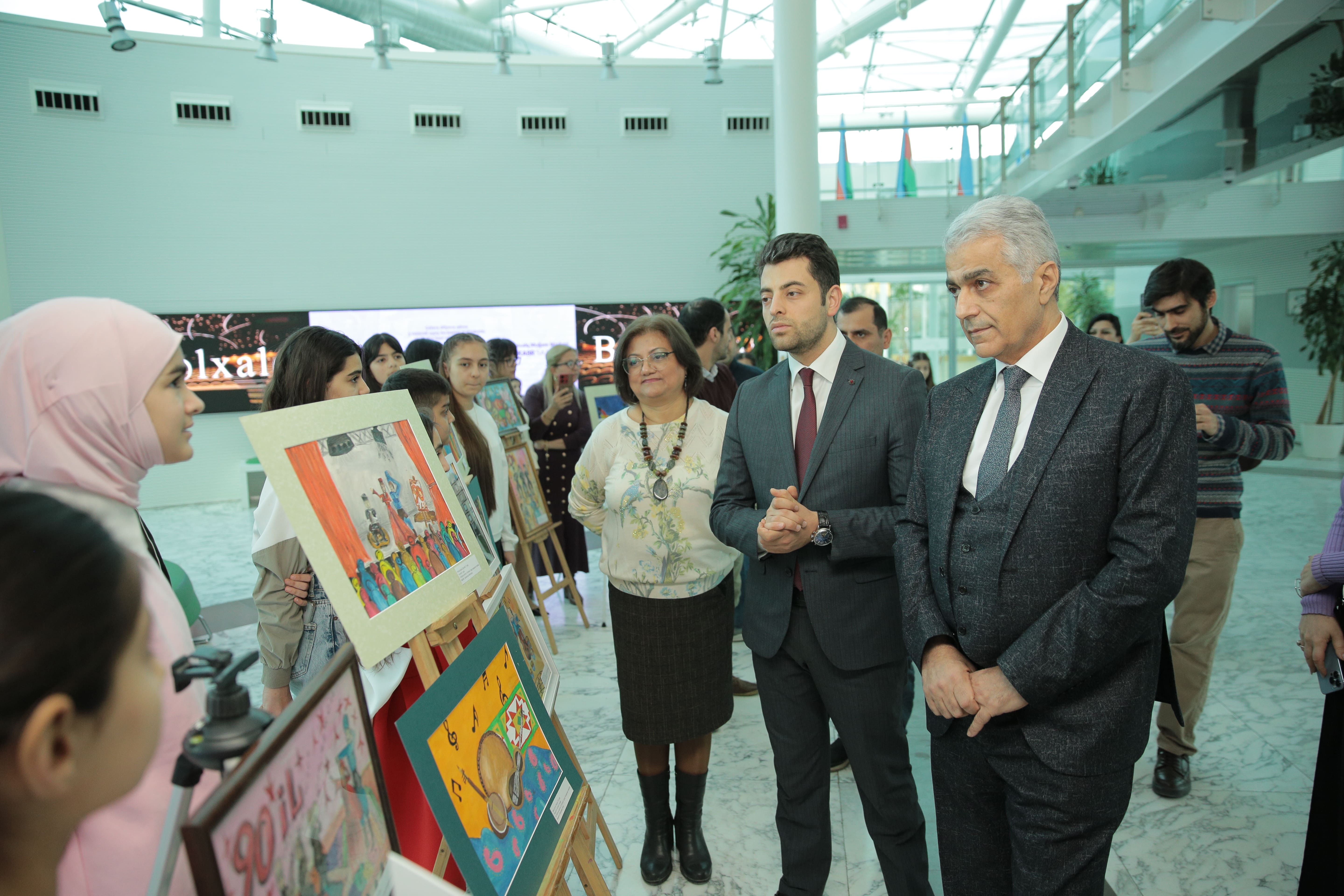 Əvvəlcə məktəbdə fəaliyyət göstərən rəsm kursunun şagirdlərinin əl işlərindən ibarət rəsm sərgisinə baxış keçirilib.