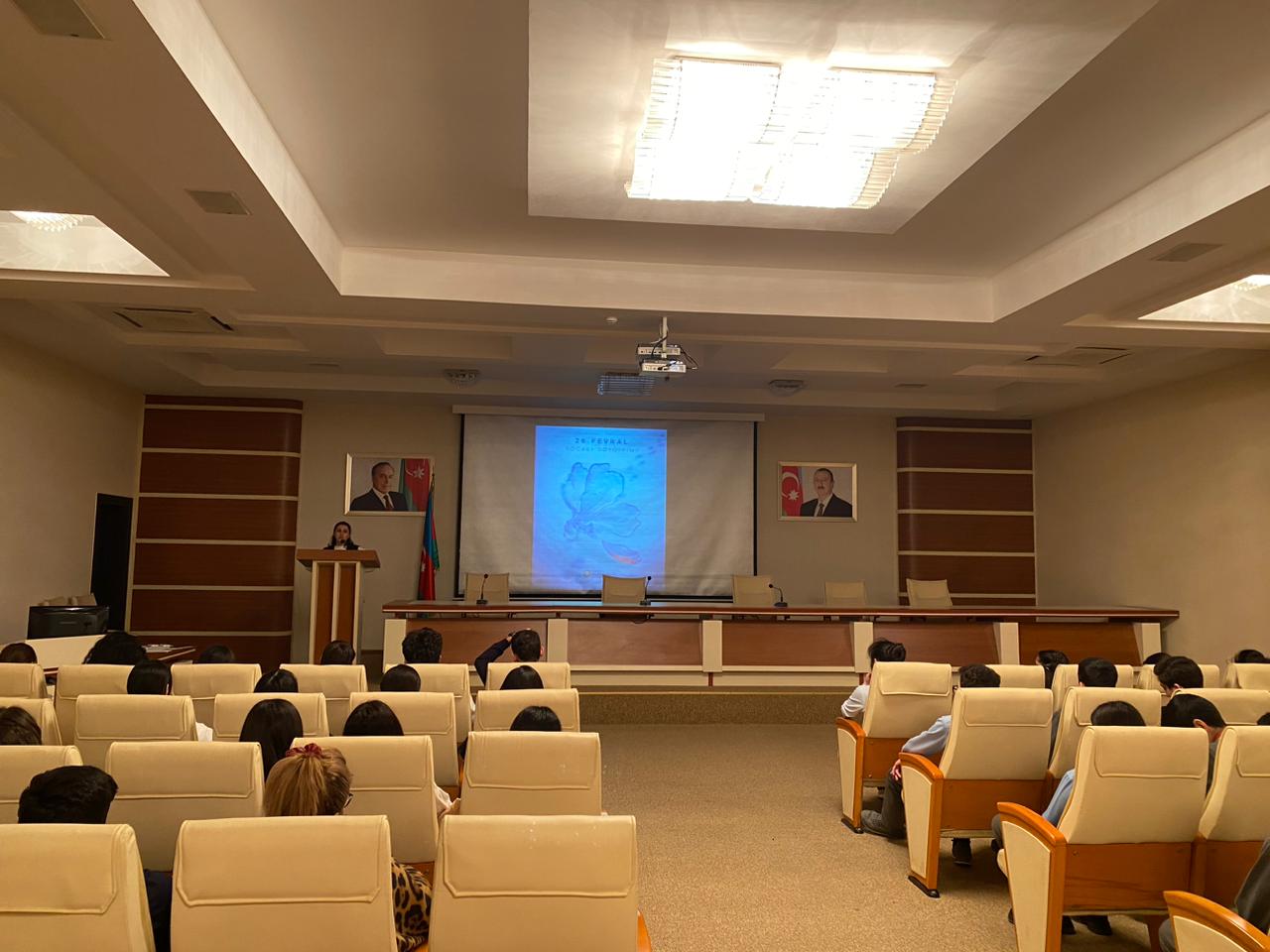 Əvvəlcə mərkəzin əməkdaşı Nuranə Davrinbəyova çıxış edərək 26 fevral – Xocalı soyqırımı haqqında ətraflı məlumat verib, faciənin Azərbaycan xalqının yaddaşında silinməz iz buraxdığını və bu hadisələrin gələcək nəsillərə çatdırılmasının vacibliyini vurğulayıb.