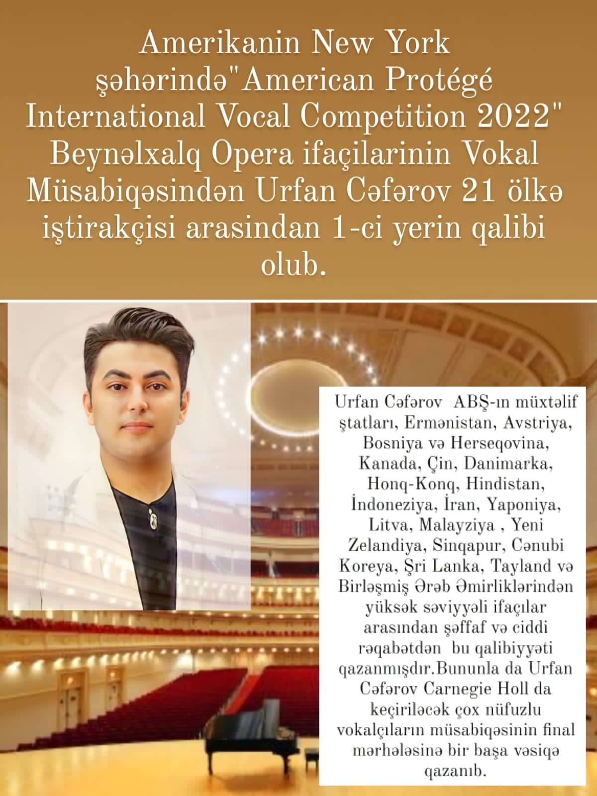 Bakı Şəhər Mədəniyyət Baş İdarəsinin Şövkət Ələkbərova adına 20 nömrəli onbirillik musiqi məktəbinin müəllimi Urfan Cəfərov Amerikanın Nyu-York şəhərində keçirilmiş "American Protégé International Vocal Competition 2022" Beynəlxalq Opera ifaçılarının Vokal Müsabiqəsində iştirak edərək 21 ölkə təmsilçiləri arasından I yerin qalibi olub.