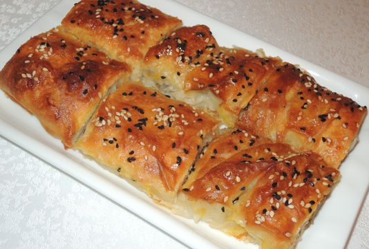 Börəyi bişirin: Sobanın orta gözündə üzəri qızılı rəng alana qədər, 35-40 dəqiqə bişirin. Sobadan çıxarıb təxminən 15 dəqiqəliyinə soyumaq üçün kənara qoyun. 15 kvadrat hissəyə bölün. Süfrəyə vermək üçün bir buludun, yaxud iri boşqabın içinə yığın. Bu börək süfrəyə bir az ilıq halda veriləndə daha dadlı olur, amma tam soyumuş halda da gözəldir.
